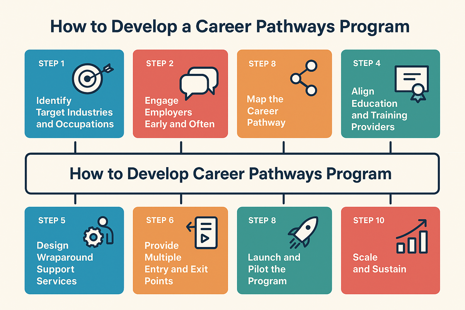 Each step reflects a practical part of building a pathways system that’s inclusive, adaptable, and rooted in real job opportunities.
